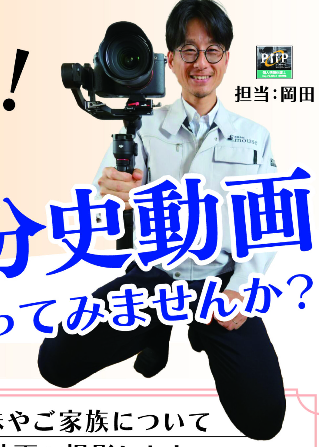 チラシの右上にいるキラキラ笑顔の人物は弊社の代表、撮影カメラマン岡田です。